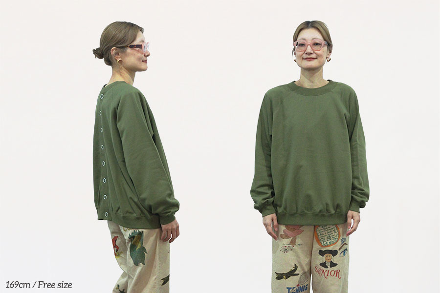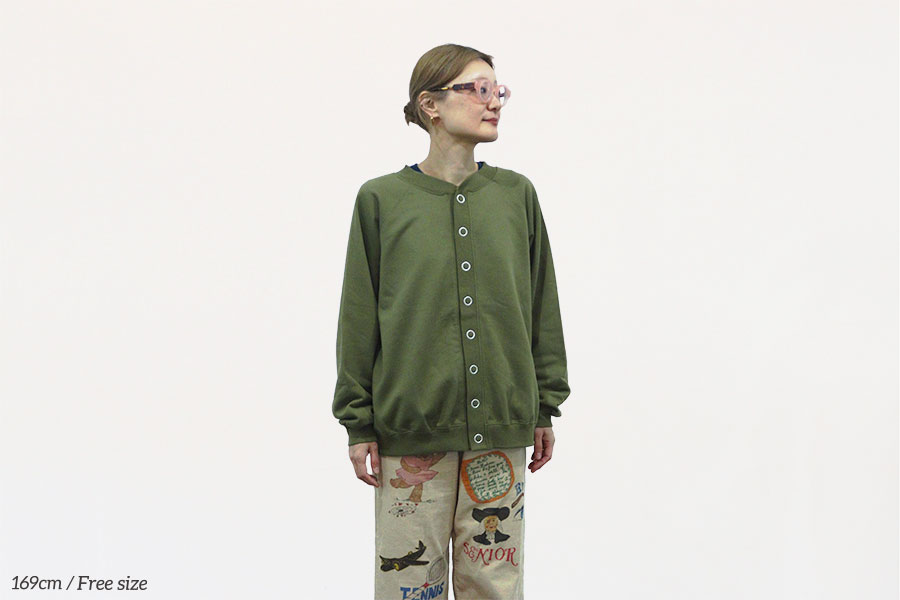 スナップボタン式で、ボタン側を前にすればカーディガンとして、後ろにすればプルオーバーとして着用できる