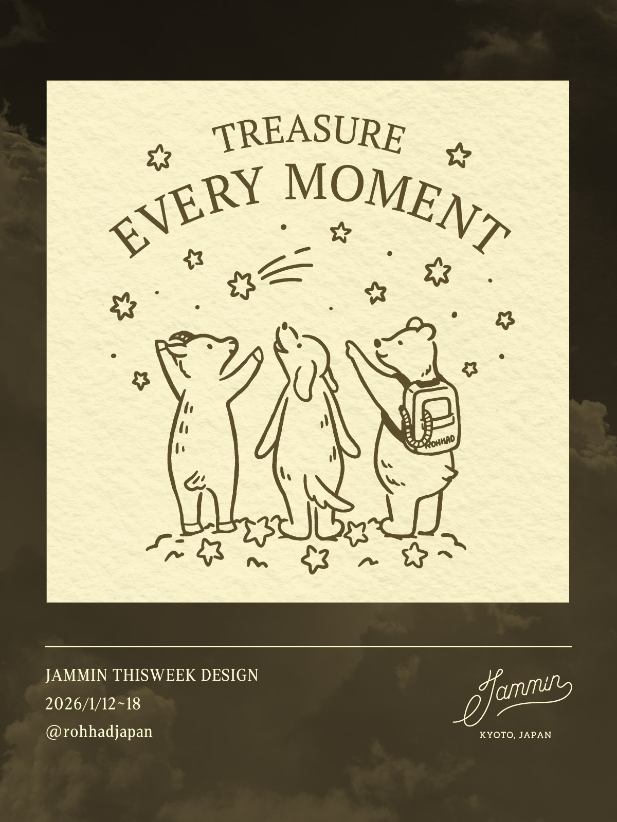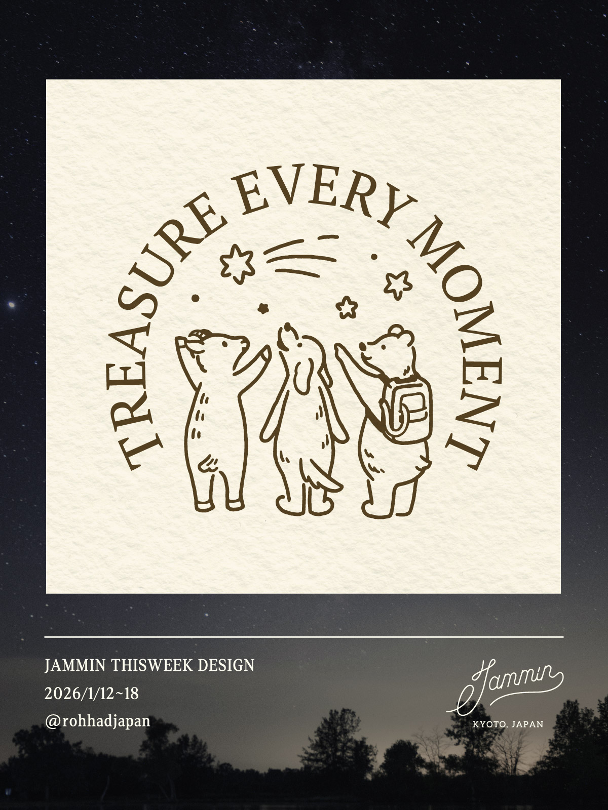 やさしいタッチで3人のどうぶつたちを描き、そこに流れる、温かい豊かな時間を表現しました。流れ星を皆で見つめる様子を描き、ローハッド症候群と闘うお子さんとその家の日々の一瞬一瞬の大切さと、病気による制限があっても、安心して穏やかに、笑顔で過ごせる未来への思いを込めました。