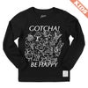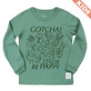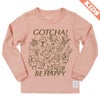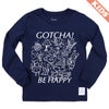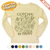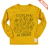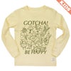 パンを焼きながら踊っているトースター、くるりんと回転する毛糸に編み物棒のツインズ、魚柄のコーヒーカップに入って散策するねこ、ガーリックを抱えたやってきたオリーブオイル(またはワイン)…。生活の中のいろんなものをたのしく描きました。いろんなものがごちゃごちゃと、でも互いにどこか愛を持って、存在し合う様子を表現しています。「ごちゃごちゃ」とかけて、"GOTCHA(了解!わかった!)"と、"BE HAPPY(ハッピーになろう)"という文言を添えました。