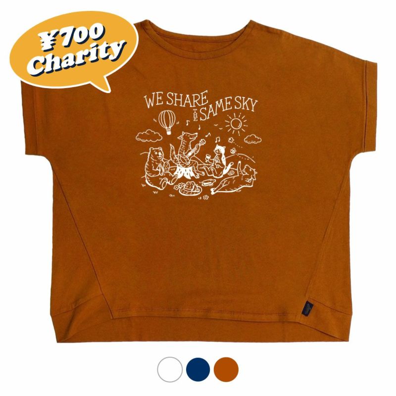 原っぱの上でくつろぐどうぶつたちの姿を描きました。歌ったり、寝転がったり、語らったり‥。それぞれが思い思いに楽しめる「がんばれ共和国」や「あおぞら共和国」をイメージしたデザインです。空には「がんばれ共和国」のメインイベントである気球が飛び、原っぱには、皆の笑顔を見守るように生前、創設者の小林さんが被っておられた帽子をやさしく描きました。"We share the same sky(僕たちは皆、同じ空をシェアしている)"というメッセージを添えました。