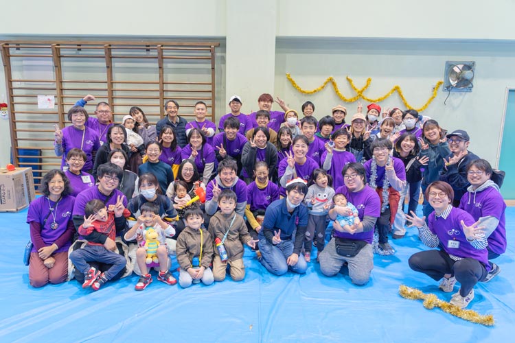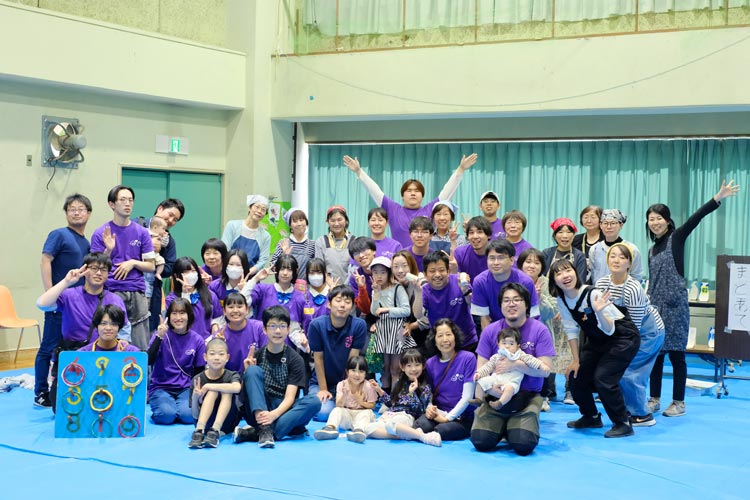 「こどもフェスタ2025」にて、当日の運営スタッフの皆さんの集合写真。「こどもから大人まで、いつでもさまざまな世代が参加してくれる山科醍醐こどものひろばでありたいと思います」