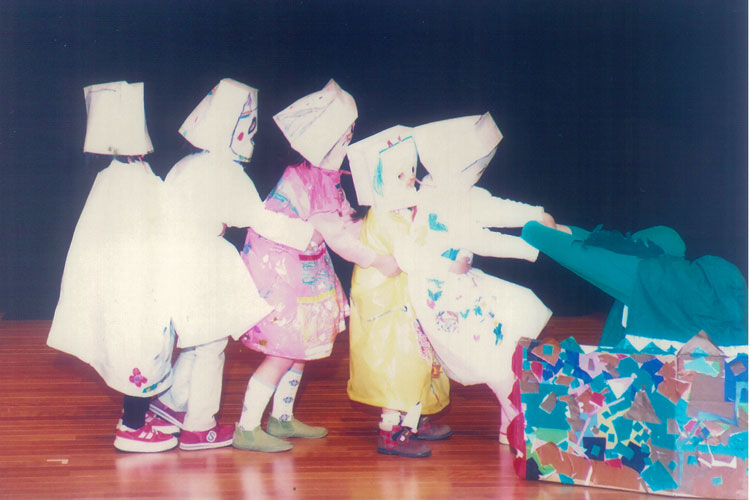 親と子の劇場時代の一枚。「おおきなかぶ」を演じているところ。衣装や小道具ももちろん手作り