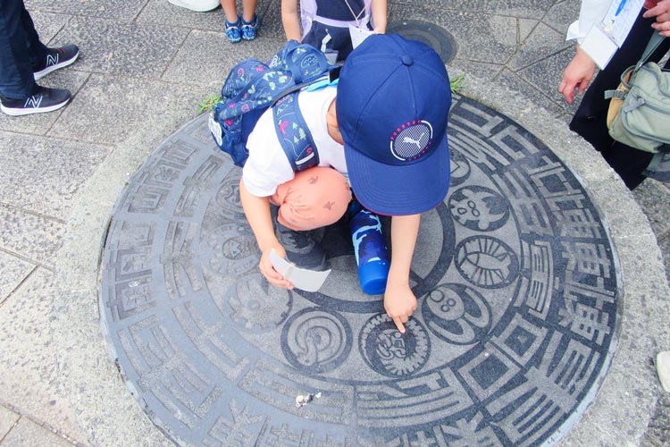 体験活動中の一枚。山科川沿いをウォークラリー中、動物の絵のある石(十二支)を見つけて大盛り上がり
