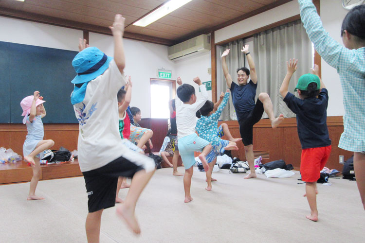 川遊びの前に、遊びながらの準備体操。「活動のいろいろなところに遊びを!」