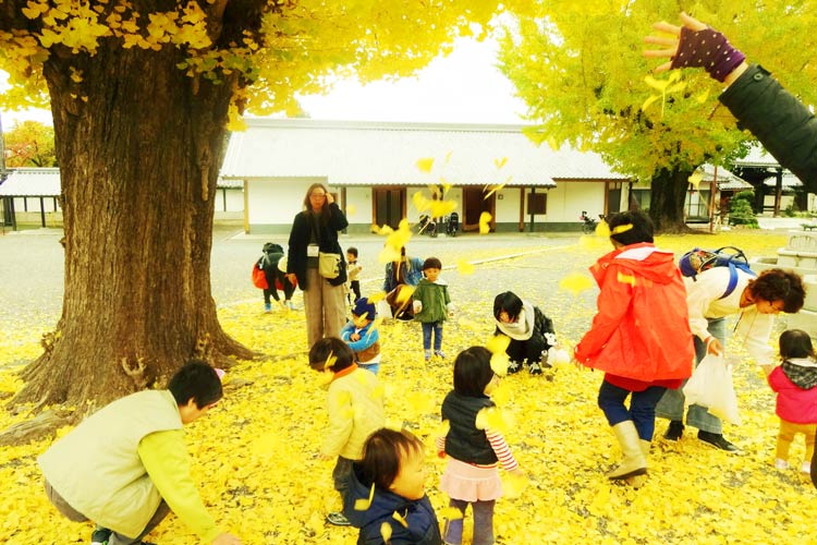 山科にある本願寺山科別院(西御坊)にある大きな銀杏の木の下で。「子どもの『やりたい』『してみたい』を確認しながら、活動づくりをしています」