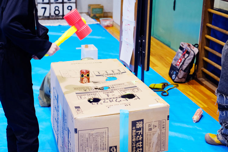 「こどもフェスタのもぐらたたきも、もちろん人力。ボランティアさんが箱に横になりながら入ってもぐらを出し入れして30秒間ひたすら叩いてもらい、お互いに汗だくに」