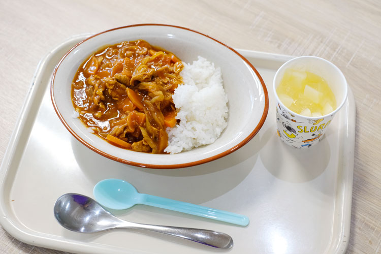 4月のこどもフェスタで販売されたハヤシライスと炭酸モモゼリー。「前回がカレーだったので、4月はハヤシライスに。炭酸モモゼリーも試作を重ねて完成しました。食材の寄付をいただき、それぞれ100円で提供できるようにしました」