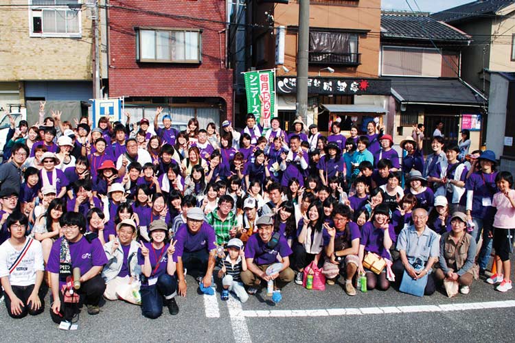 2013年に開催されたこどもフェスタの集合写真。「地元の商店街と協力し、こどもフェスタの日には、商店街を歩行者天国にしてこどもが1日遊べる空間を作っていました。ボランティアも100名以上いました」
