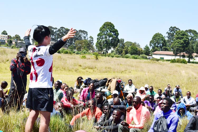 2026年1月に、ケニア・ニャフルルで、ケニア初の駅伝が開催された。参加した人たちに、駅伝について説明する高村さん