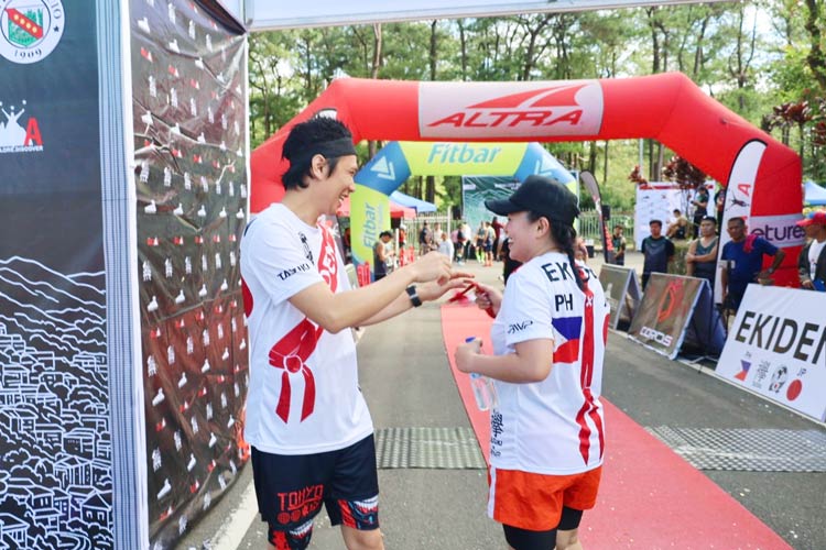 フィリピン駅伝にて、夫婦間で襷がつながれる瞬間の一枚。「襷をつなぐ瞬間は、自然と笑顔になります」