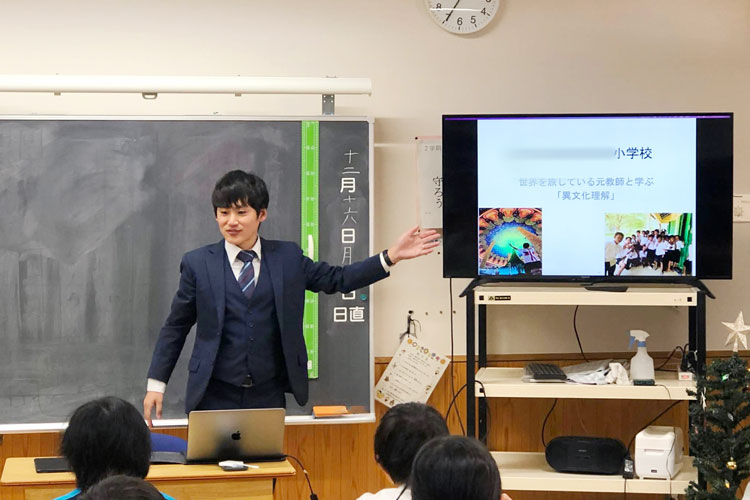 埼玉県の小学校で講演会をした時の写真です。これまで、中学校に向けてのオンライン英語授業(ホームステイ先の方と英語で話す)や、帰国時には講演活動をしてきました。私がこの駅伝普及活動を始めたのは、多くの経験をして『魅力的な教育者』になりたいから。これからも、私が感じた世界のリアルを、少しでも多く、日本の子どもたちに伝えていきたいと思っています」