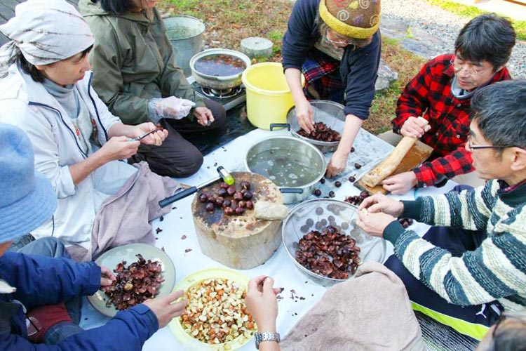 トチノキの食文化の象徴、トチノミの皮むき。「大変な作業も、みんなで集まって力を合わせればまた楽し!デンプン含量の高いトチノ実は、かつては米の代用食として利用されてきました。しかしながら、トチノ実は、アクが強くそのままでは人間は食べることができません。アクを抜くための前段階として、実の皮むき作業をします。実を食べられるようにする作業のうち一番地味な作業で、退屈な作業。そこをみんなで楽しく作業することで、楽しいものに変えていきます。山村の食文化をつないでいく地味な作業が人をつなぎ、トチノ森をまもっていく」