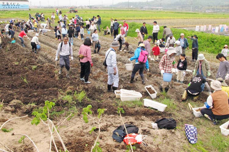 「近年、シカの増殖によってトチノキの自然再生が難しくなってきています。写真は、朽木トチノキ林で採取した実を発芽させた後、シカ害を受けなくなるまで琵琶湖のほとりの休耕田で育てたのち、生まれ故郷に返そうという試みをしているところです」