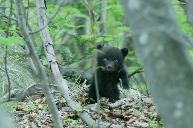 「滋賀県高島市朽木でのトチノキ伐採問題が一段落した頃、長浜市の木之本町金居原という岐阜県境に近い場所でも、トチノキの買い占めに端を発した巨木林の伐採問題が勃発しました。そこで、この地域性を調査すべく山に入っていた時に、生まれて間もない、親グマから離れた子グマと遭遇しました。驚きと恐怖からカメラを持つ手は震えました」