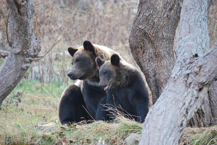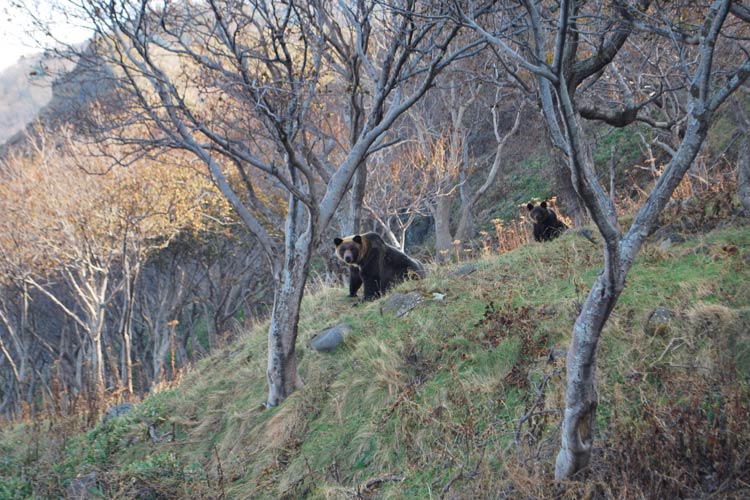 知床で見かけたヒグマの親子。「母グマは、子グマに独り立ちができるようになるまで、愛情いっぱいに生きるすべを教えます」