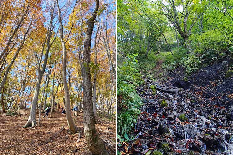 (写真左)「朽木と福井県の境には見事なブナ林が広がっており、谷筋にはトチノキをはじめとした豊かな植生があります。大型のワシ、タカ類も飛び交い、可憐な花たちも咲き誇っています」。(写真右)「金居原土蔵の南、岐阜県との県境鞍部。一方は杉の川へと、一方は八草川へと流れていきます」
