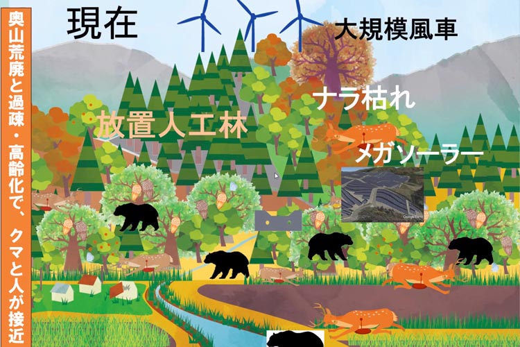 クマをはじめとする野生動物が暮らしていくための自然と生態系のあった奥山。人工林や大規模風車、メガソーラーの設置などで奥山の環境はどんどん失われ、一方で人が入らなくなった里山にクマが出没するようになった
