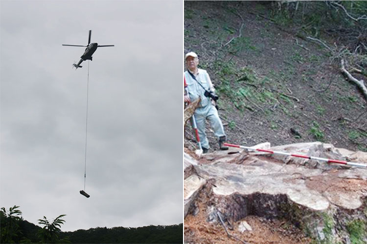 ヘリコプターで運び出されるトチノキ。「(写真左)切り倒されたトチノキが朽木の空高くヘリコプターで運ばれるさまを見た時の衝撃は、今も鮮明に記憶の中にあり、その驚きと戸惑いは筆舌につくし難いです。(写真右)伐採現場の切り株から、生えていた大きさを推測した時の心の痛みと後悔は、今も残っています。経済価値のない幹や、運び出すのに支障のある木までをどんどん切り倒し、谷に放置した行為への怒りは、今も消えることはありません」