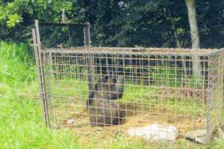 罠に捕まったクマ。「兵庫県で箱罠に掛かったツキノワグマ。クマが大好きな米ぬかが誘因物となっていた」