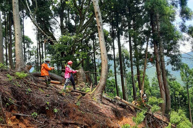 滋賀県高島市朽木で広葉樹林化を進めるための道づくりの作業(ここでは間伐)をしている