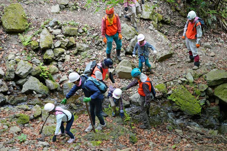親子向けの自然体験教室での一枚。「仲間同士で助け合い、お子さんが安全に沢を渡れるようにサポートします」