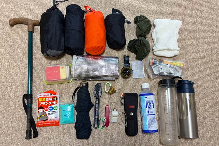登山の際のリュック内の装備の一部。ストック、カッパ上下、ヤッケ、スパッツ、皮手袋、タオル、常用薬、レジャーマット、GPS機能付き腕時計、ミラー(裏面はエマージェンシーカード)、非常食、緊急用ブランケット、レサコ(人工呼吸用補助具)、傘、ブラシ、鈴、十徳ナイフ、呼子、クマスプレー、OS-1、常温用水筒、冷温水用水筒