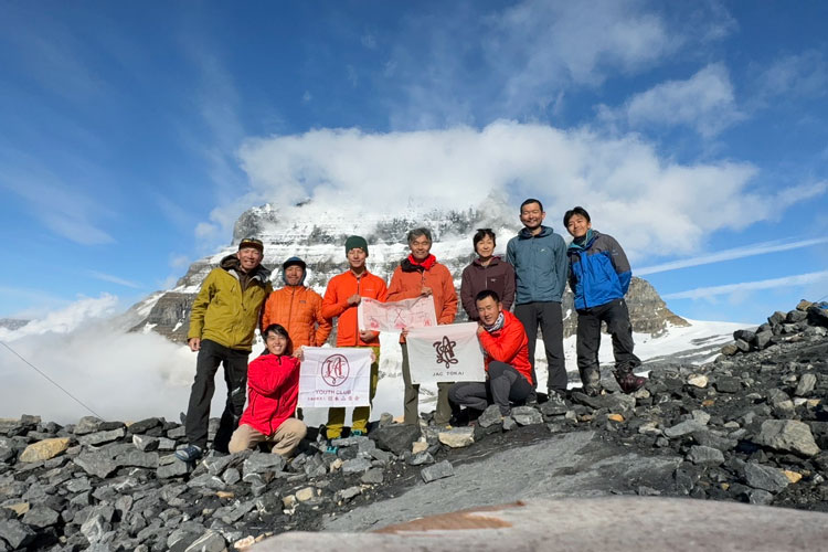 日本山岳会創立120周年記念事業のひとつとして、カナダのアルバータ峰初登頂100周年を記念し、アルバータ峰に登ったユースクラブ。アルバータ峰をバックに集合写真