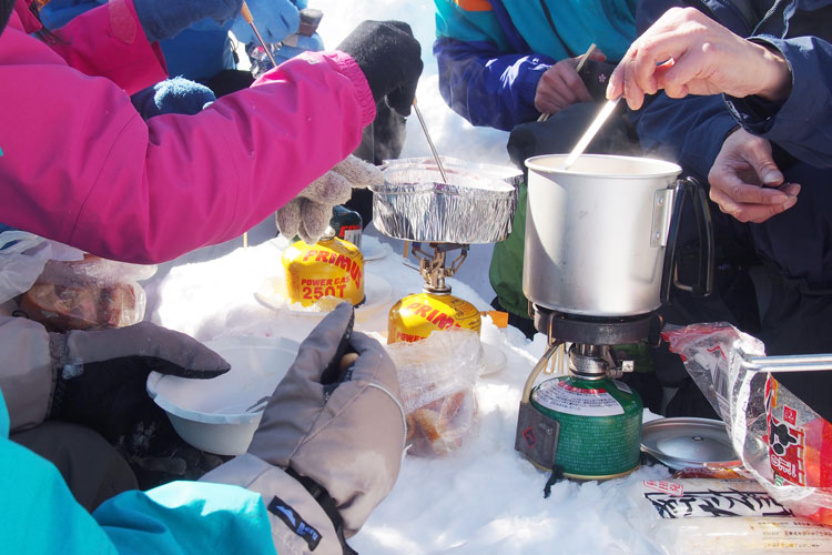 皆で食材を持ち寄っての食事会。「冬は食料が凍ってしまうため、いろいろと準備にも気をつかいます。冬用のガスコンロを用意します」