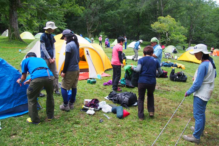 上高地、徳澤園でのテント講習。日本山岳会では初級者向けに、読図講習や気象講習、医療講習など1年を通して行っている