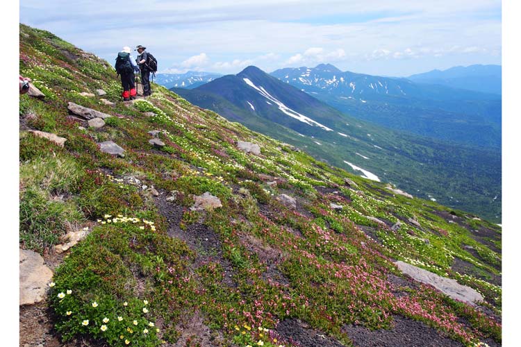 北海道の十勝岳から美瑛岳へ。チングルマ群落をはじめとする高山植物が山麓一面に咲き誇り、見渡す限り花畑が続く
