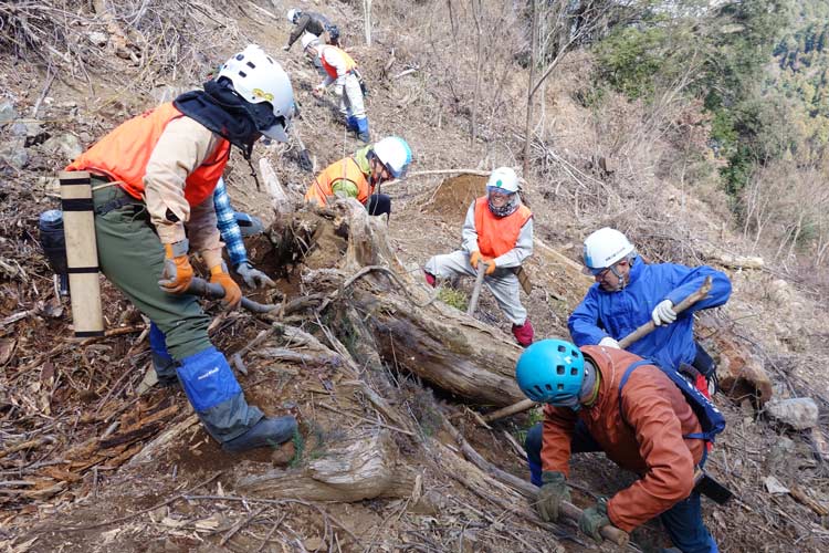 大塚さんが携わっている森づくり活動の様子。植栽地整備の為の作業道を通すために、急な斜面に横たわっている重い枯れ木を、皆で力を合わせて取り除く