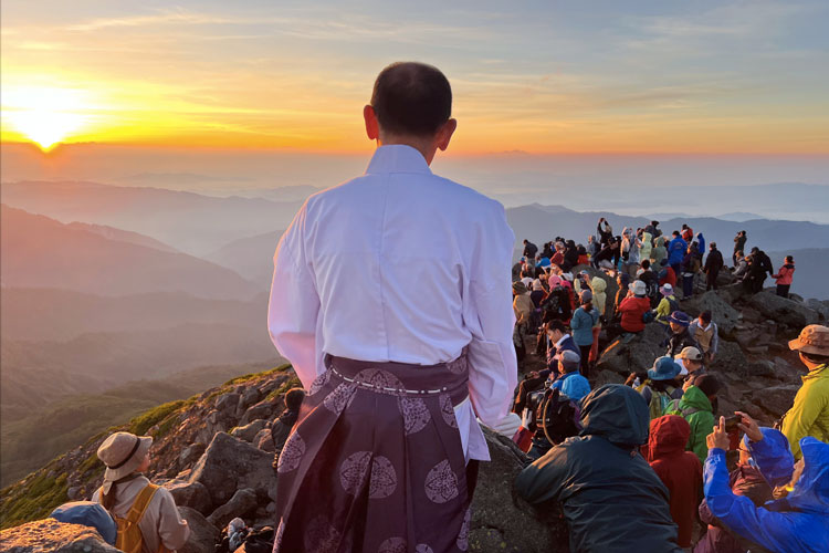 霊峰白山には美濃、越前、加賀の三馬場より続く「禅定道」の山岳古道が残る。最高峰の御前峰では、ご来光を神主とともに迎える