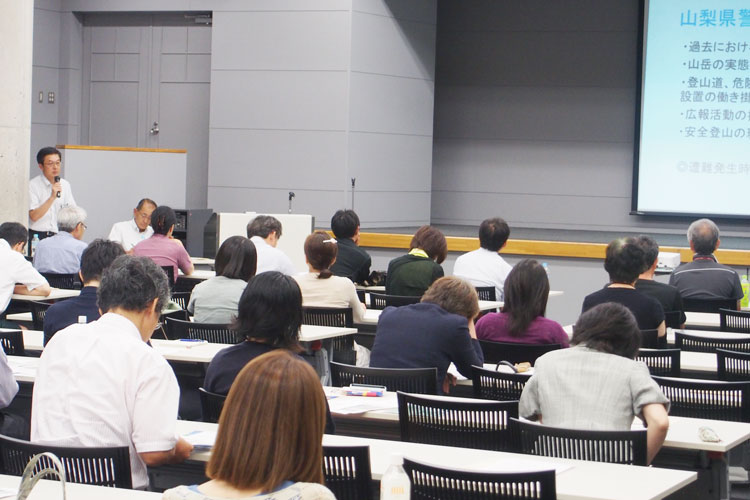 毎年、日本山岳会の遭難対策委員会によって行われる安全登山講習会。「一般市民の方を対象に企画している講習会で、長野県警、山梨県警、富山県警などにお話をしていただいています」